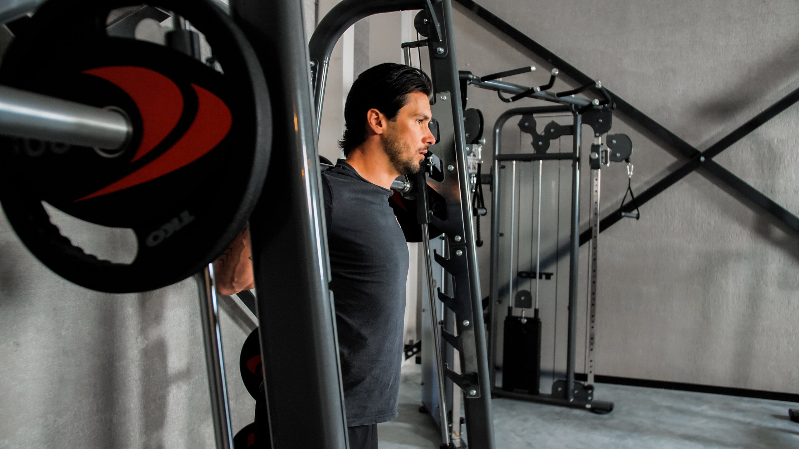 Door de barbell op schouderhoogte in het squat rack te plaatsen, kun je veilig en makkelijk aan de slag met lunges of reverse lunges met gewicht.